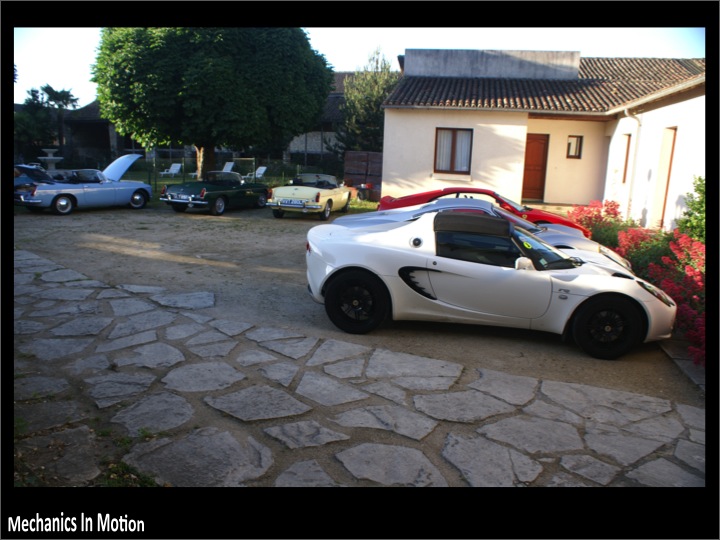 Le temps du diner, un groupe d’Anglais arrivent avec de belles MG. Une Lotus Elise R (que les fidèles lecteurs de ce blog connaissent déjà) finit de remplir le parking de l’hôtel. Il est temps d’aller se reposer car demain le réveil se fait tôt pour rejoindre l’Isle-Jourdain.